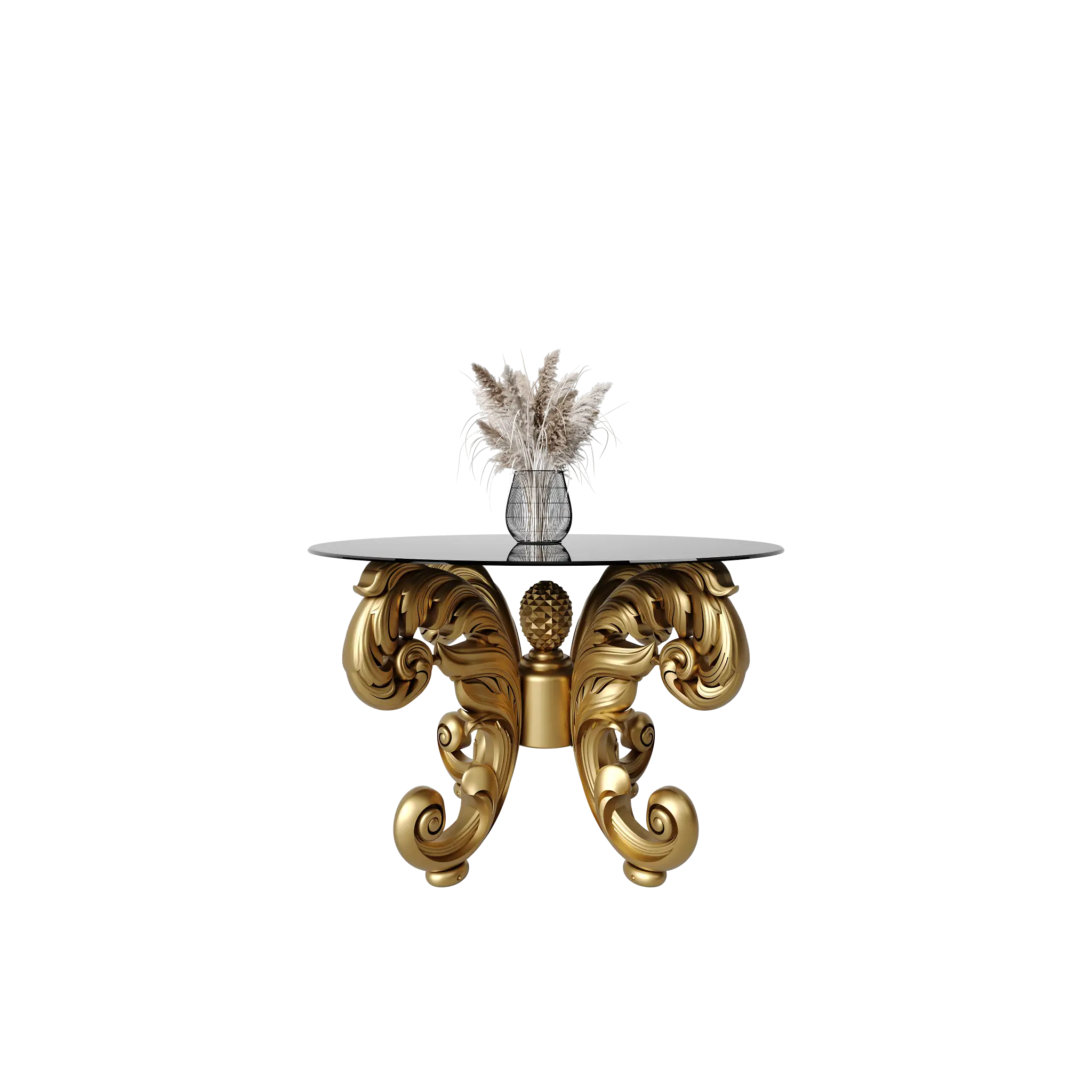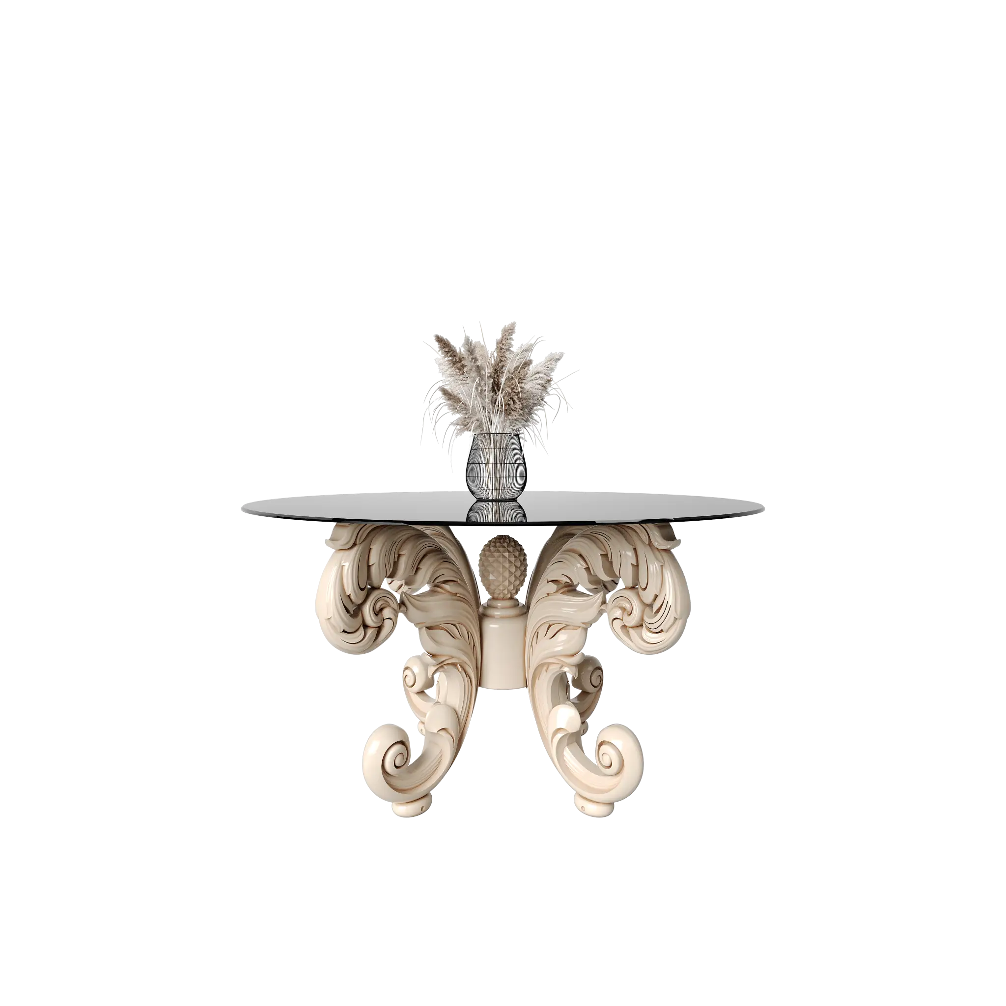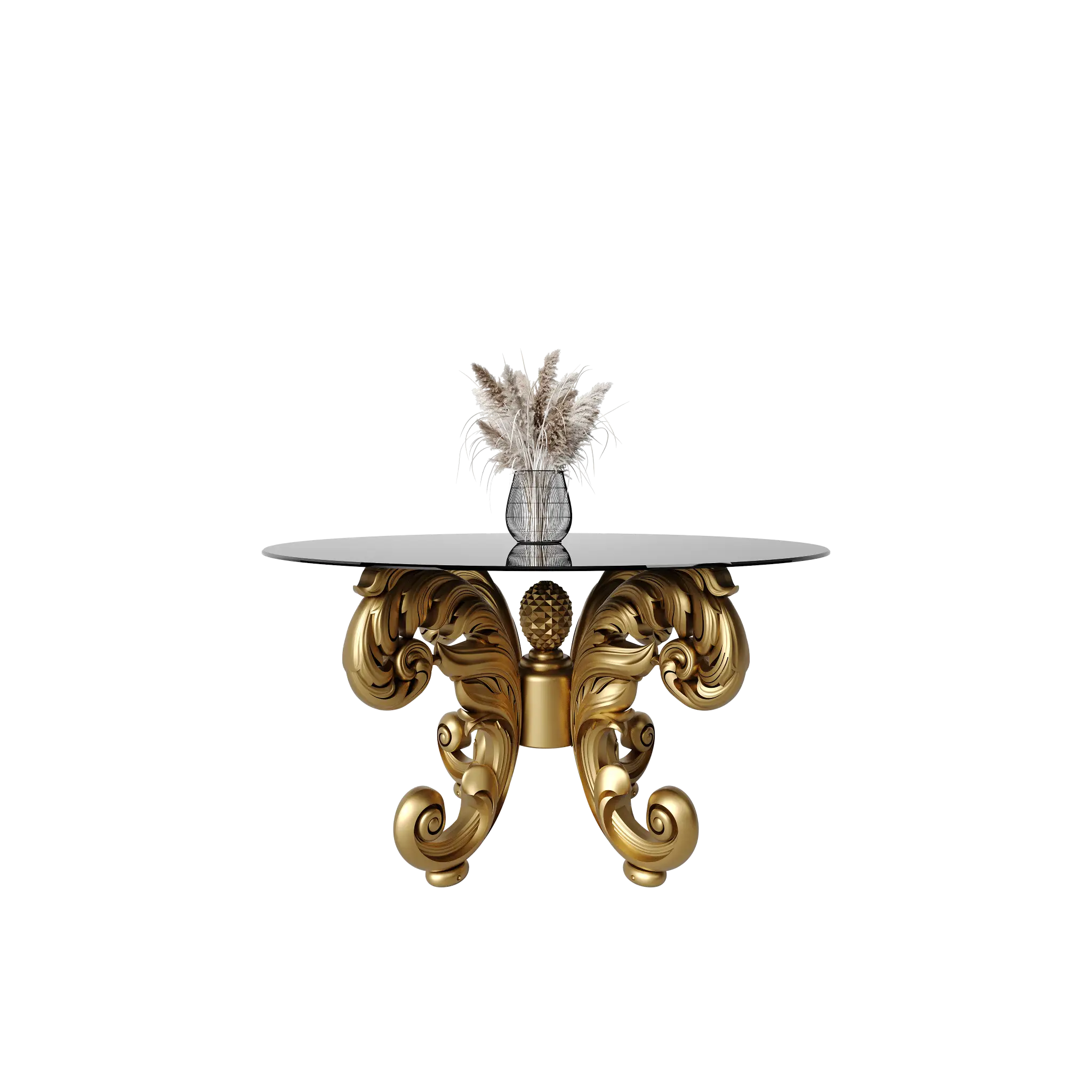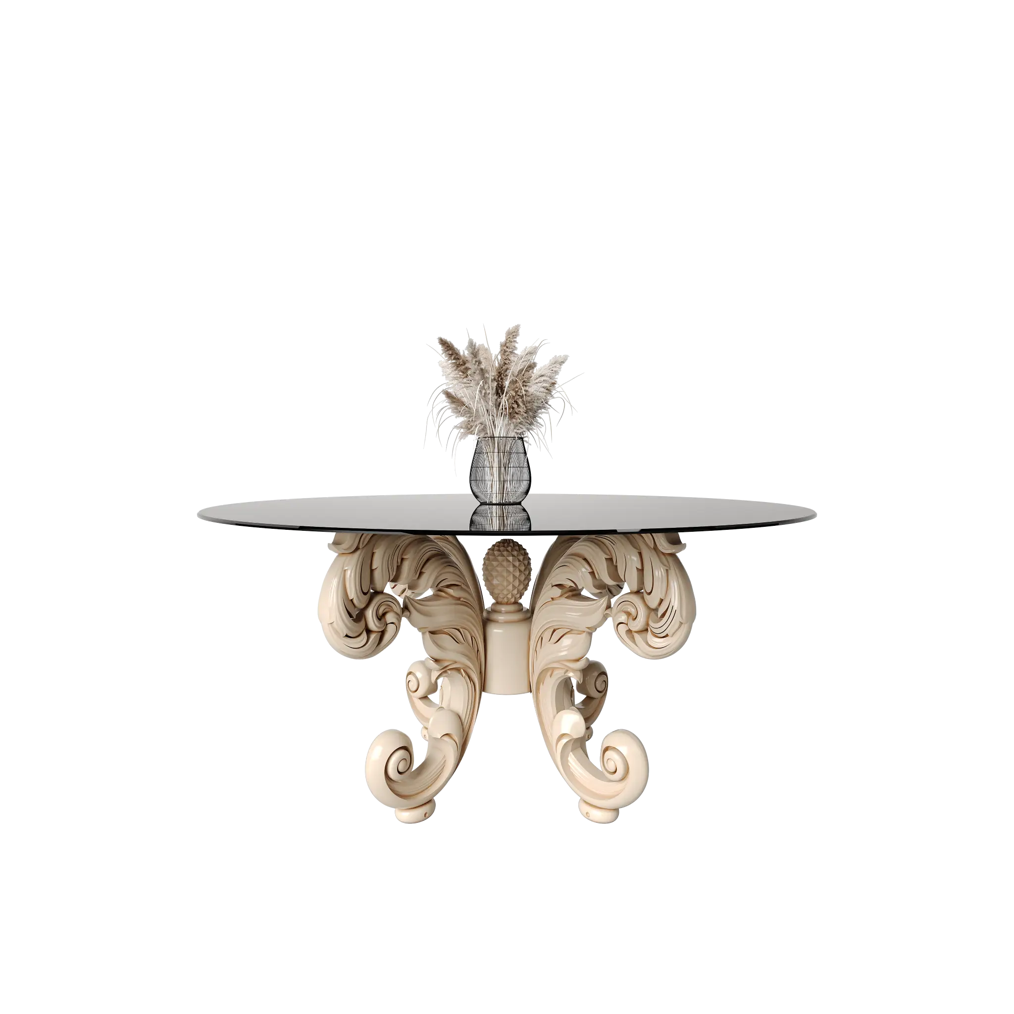میز نیلا با فرم گرد و چهار پایهی منبتکاریشده که بهصورت نیمحلال کنار هم قرار گرفتهاند، جلوهای فاخر و چشمنواز به هر فضا میبخشد. جزئیات ظریف و هنرمندانه روی پایهها، اصالت و ظرافت کلاسیک میز را دوچندان کرده و طراحی مستحکم آن، دوام و استواری را تضمین میکند. سطح میز با شیشهای مقاوم پوشانده شده که علاوه بر زیبایی، امکان استفاده راحت و محافظت از سطح میز را فراهم میآورد. این میز انتخابی ایدهآل برای تالارها، رستورانها و فضاهای پذیرایی کلاسیک است، جایی که هر میز باید هم جلوهای خاص و هماهنگ با دکوراسیون داشته باشد و هم استحکام و کارایی را ارائه دهد. اندازه میز قابل تغییر است و تا ۱۰ نفر را بهراحتی پذیرایی میکند.