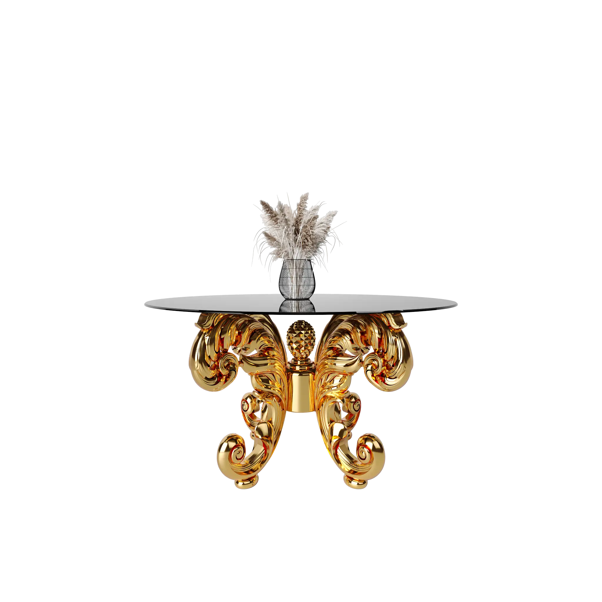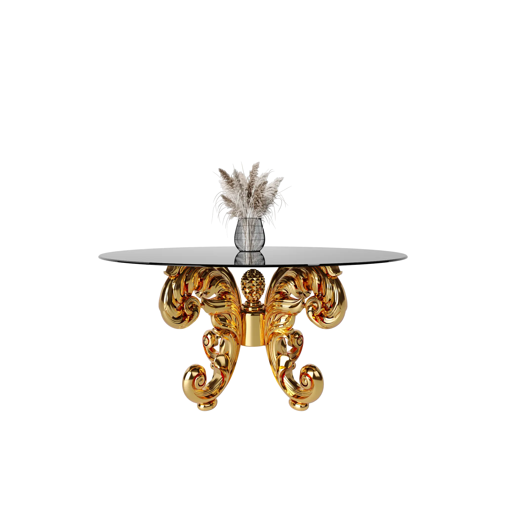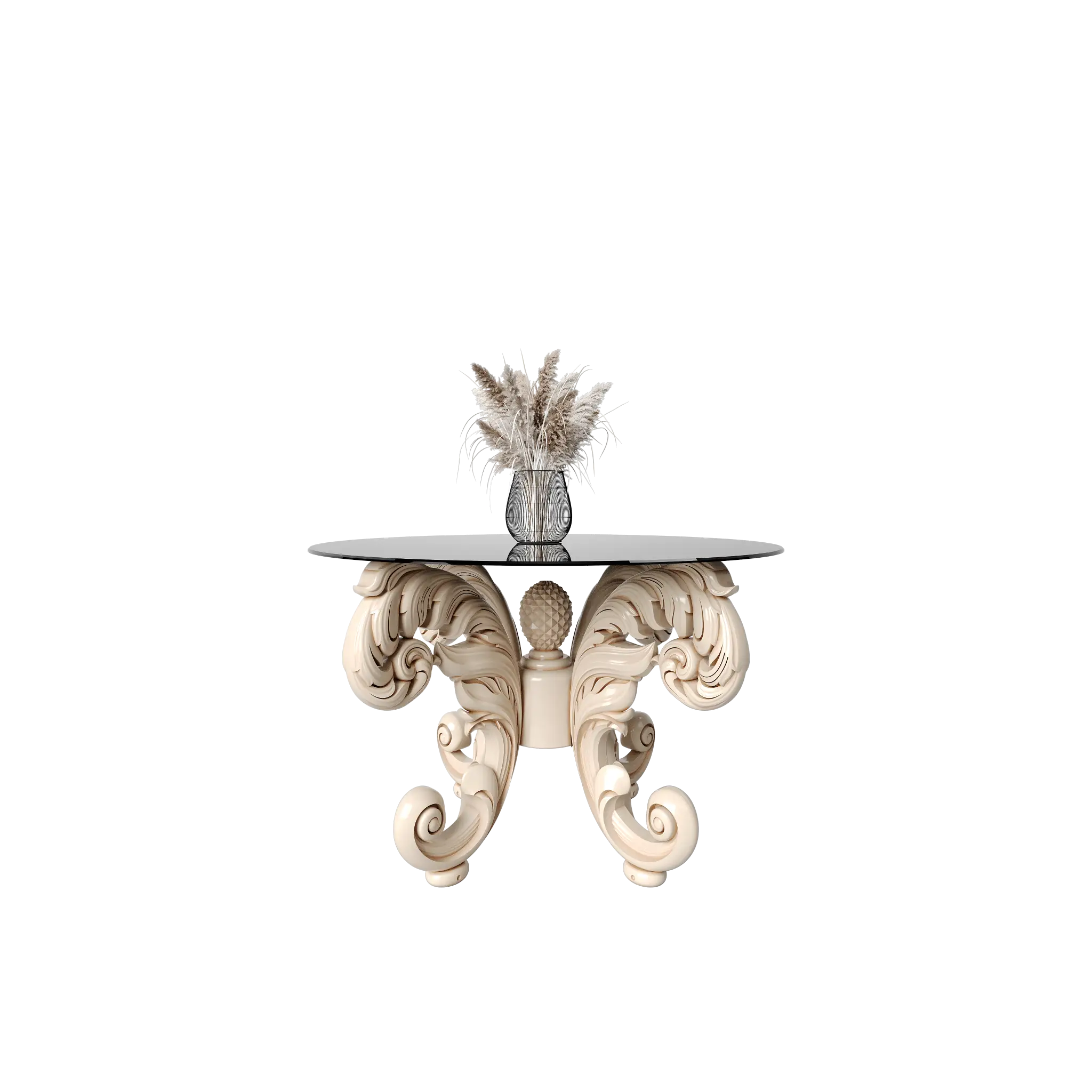 میز نیلا با فرم گرد و چهار پایهی منبتکاریشده که بهصورت نیمحلال کنار هم قرار گرفتهاند، جلوهای فاخر و چشمنواز به هر فضا میبخشد. جزئیات ظریف و هنرمندانه روی پایهها، اصالت و ظرافت کلاسیک میز را دوچندان کرده و طراحی مستحکم آن، دوام و استواری را تضمین میکند. سطح میز با شیشهای مقاوم پوشانده شده که علاوه بر زیبایی، امکان استفاده راحت و محافظت از سطح میز را فراهم میآورد. این میز انتخابی ایدهآل برای تالارها، رستورانها و فضاهای پذیرایی کلاسیک است، جایی که هر میز باید هم جلوهای خاص و هماهنگ با دکوراسیون داشته باشد و هم استحکام و کارایی را ارائه دهد. اندازه میز قابل تغییر است و تا ۱۰ نفر را بهراحتی پذیرایی میکند.